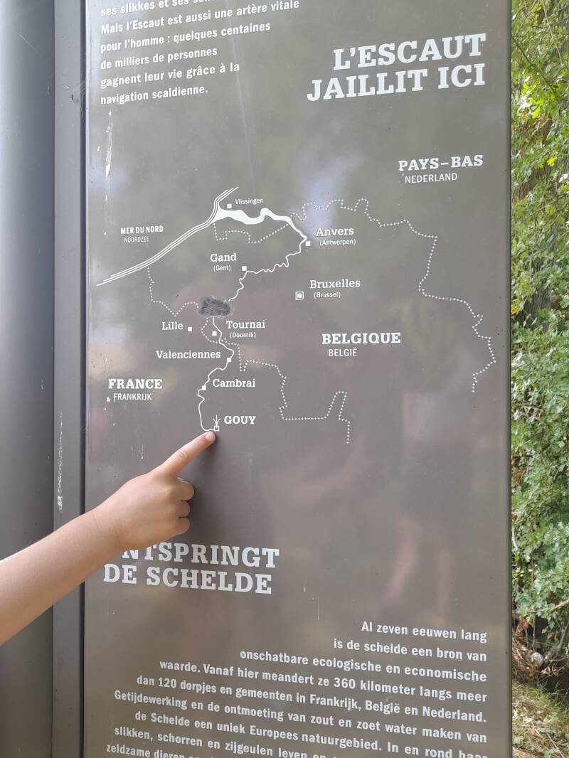Ook vandaag is het een warme dag. Er hangt meer bewolking maar dat maakt het veel benauwder. We klimmen veel en het landschap wordt wat afwisselender. Er staat een bord langs de weg met; de bron van de Schelde 350 meter. We rijden de weg in en komen in een aangenaam groen beekdalletje. Bij de bron staat een mooi beeld en alles ziet er heerlijk frisgroen uit. Wat een verademing om even in een andere omgeving te zijn. Helaas moeten we verder en meteen volgen er een aantal lange klimmen. Het 'zo gaat ie goed, zo gaat ie beter' werkt niet meer en we moeten de kinderen veel moed inpraten. Gelukkig volgen we op de laatste paar kilometers naar Saint Quentin het kanaal en nemen we afscheid van de heuvels. We ploffen samen met onze bagage neer op de camping. Fijn dat we er zijn en tijd voor een verkoelend ijsje!