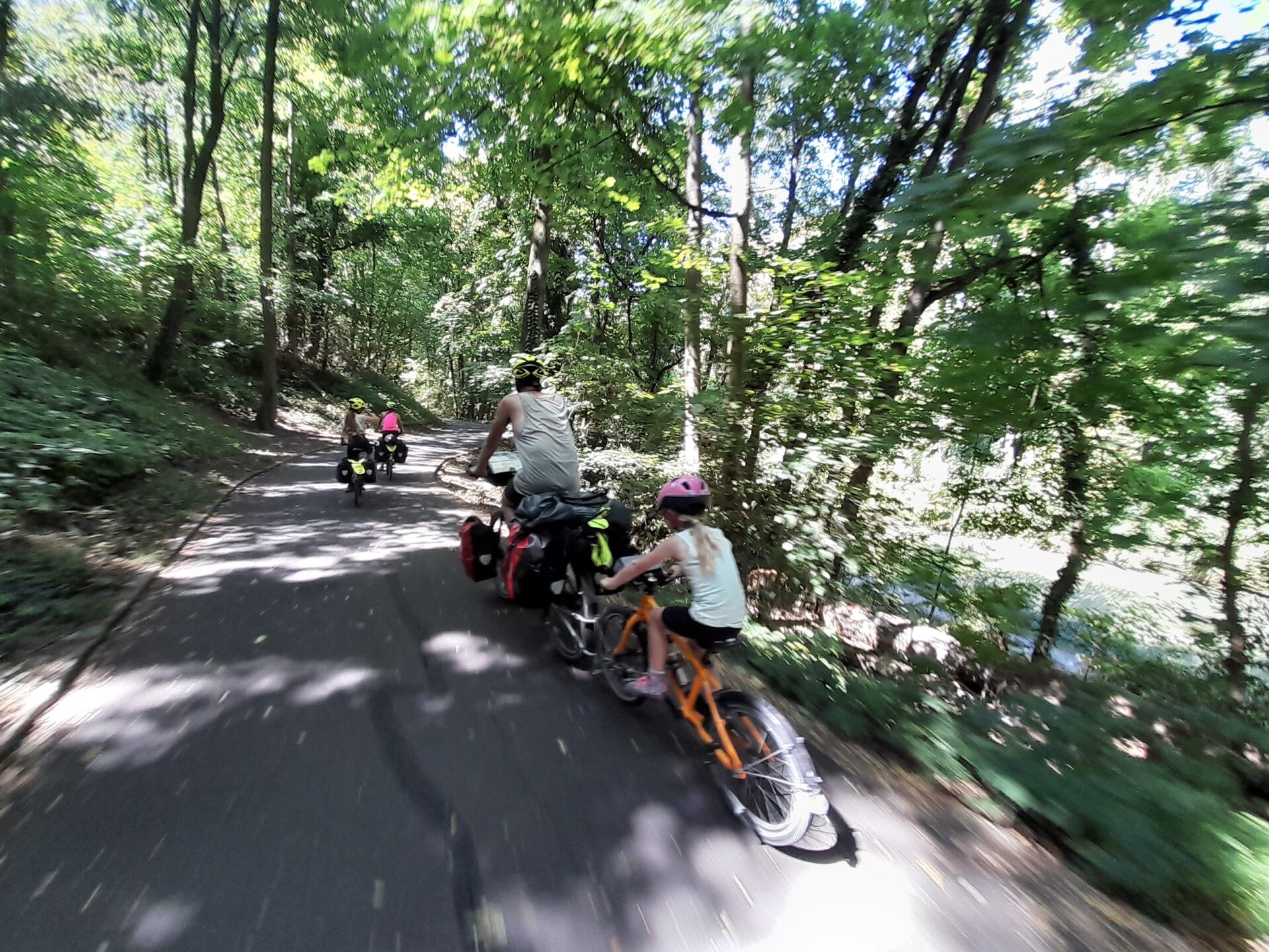 Gelukkig komen we snel op de route. Dit is een rustig fietspad langs een kanaal dat Parijs instroomt. We hebben wind in de rug. Het fietspad loopt golvend omhoog en omlaag en er is genoeg groen dat voor de nodige schaduw zorgt. We zijn snel de ellendige start van de dag vergeten.